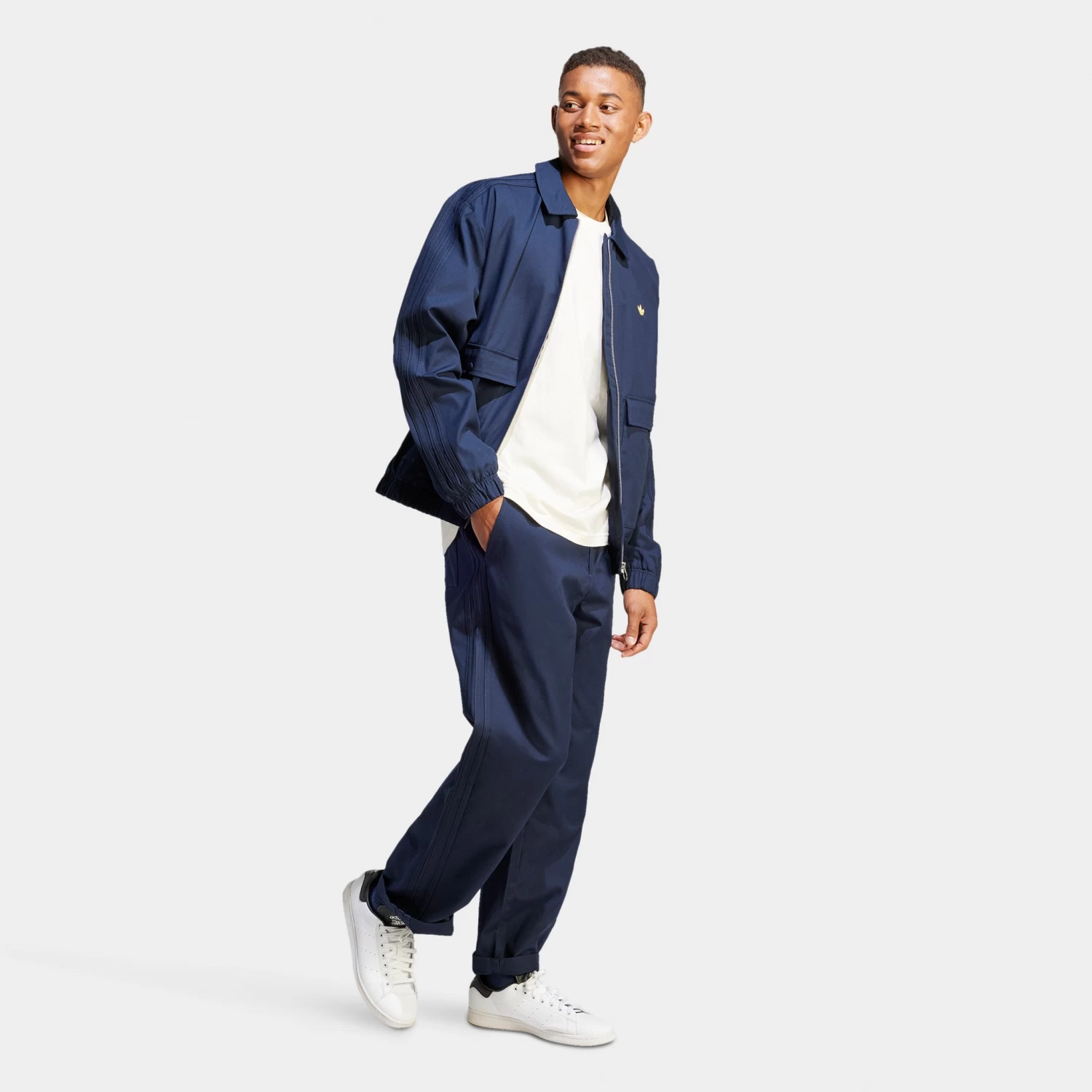 - Small embroidered Trefoil logo on left thigh